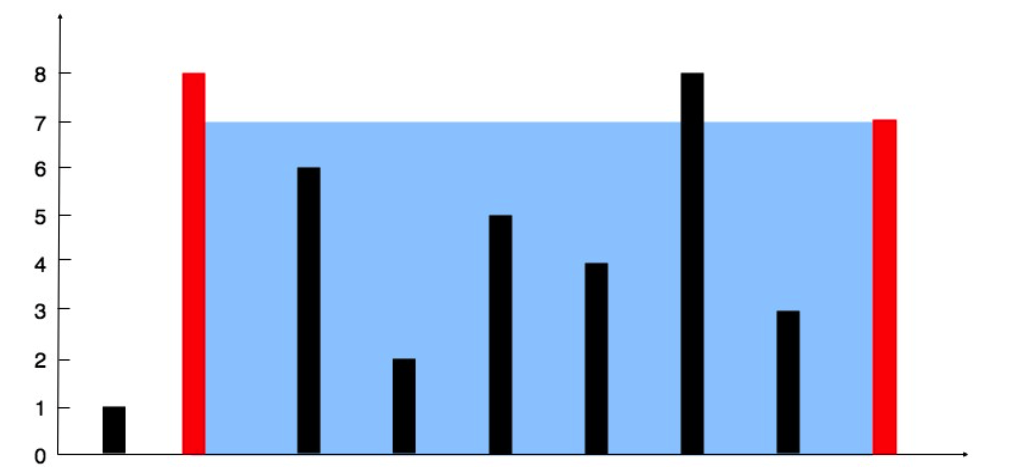 给你 n 个非负整数 a1,a2,…,an,每个数代表坐标中的一个点 (i, ai) 。在坐标内画 n 条垂直线,垂直线 i 的两个端点分别为 (i, ai) 和 (i, 0) 。找出其中的两条线,使得它们与 x 轴共同构成的容器可以容纳最多的水。