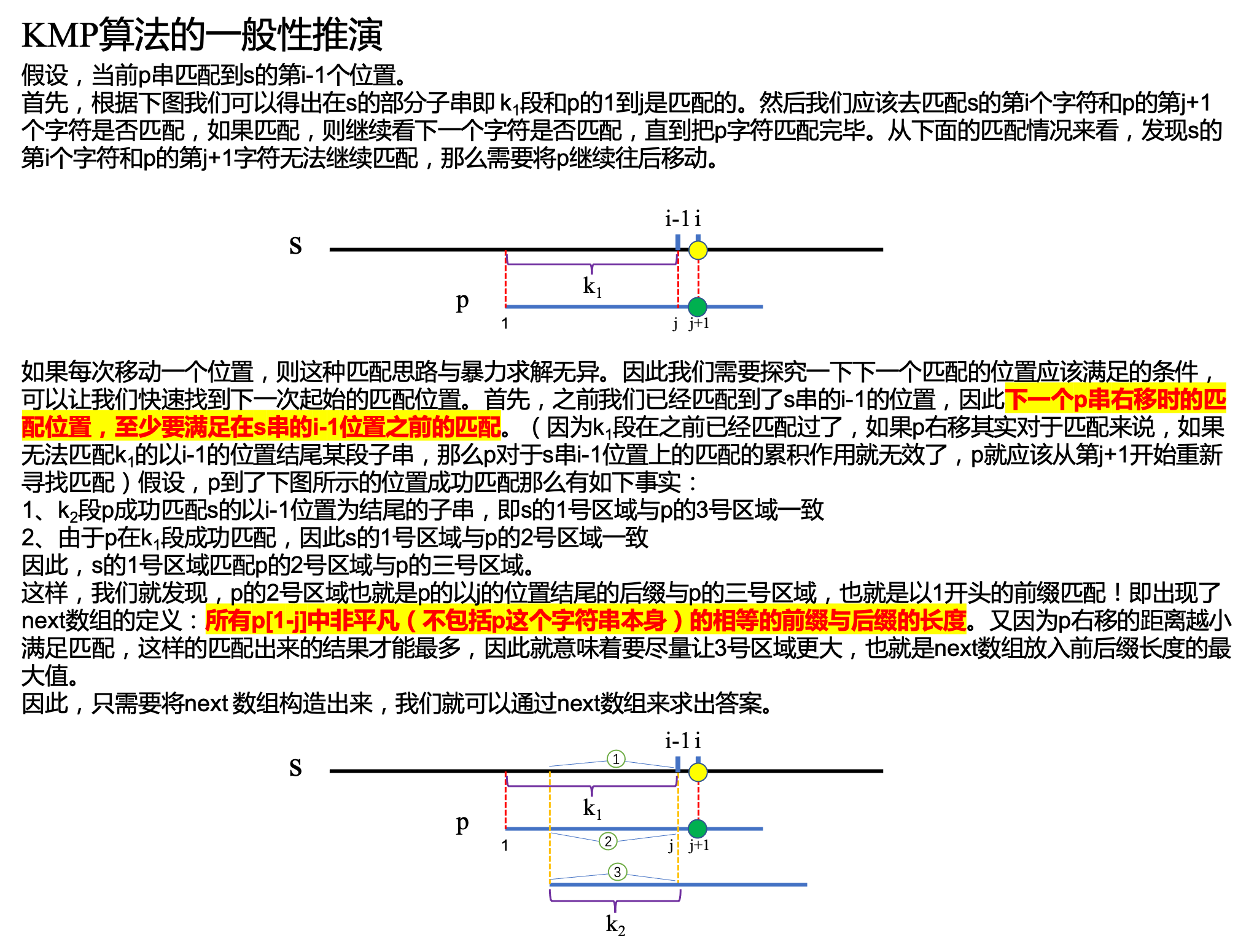 1、定义一个next数组,记为next[j],意思是所有p[1-j]中非平凡(不包括p这个字符串本身)的相等的前缀与后缀的长度的最大值记录一个next[j]。这里的前缀和后缀表示:从下标1开始的前缀和以j为结尾的后缀。