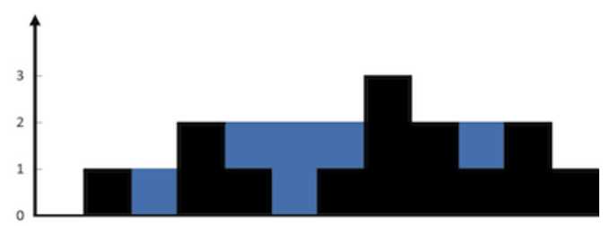 解释:上面是由数组 [0,1,0,2,1,0,1,3,2,1,2,1] 表示的高度图,在这种情况下,可以接 6 个单位的雨水(蓝色部分表示雨水)。