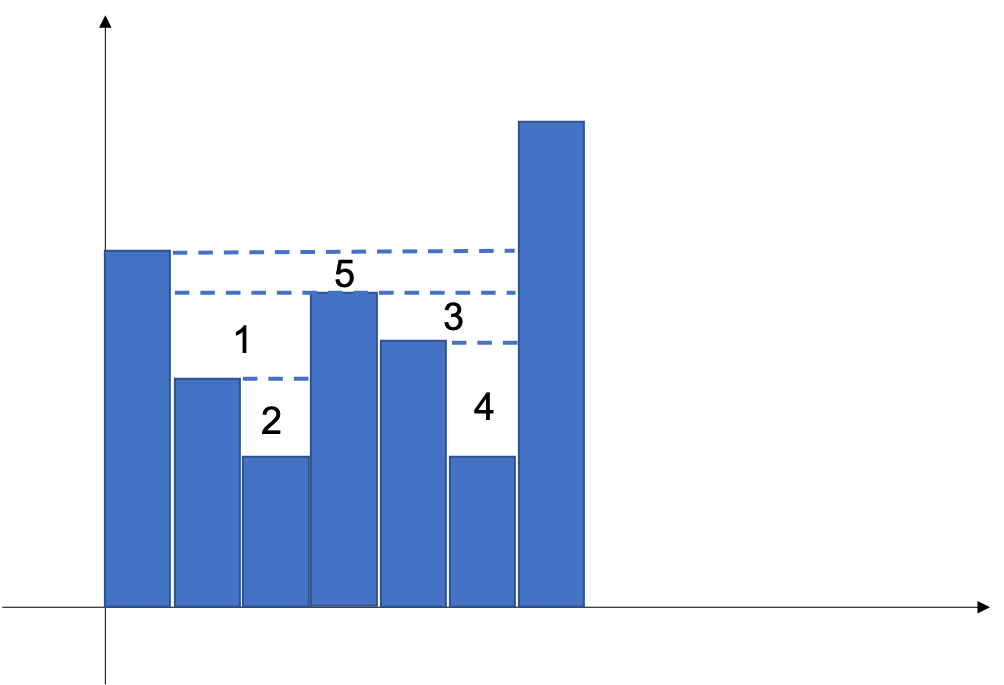 在本题中,我们可以考虑每个位置左边和右边的第一个比自身高的矩形条,以及三个矩形条构成的 U 型,这里就相当于对水的面积按行进行拆解。这里可以考虑维护一个严格单调递减的单调栈,具体操作如下: