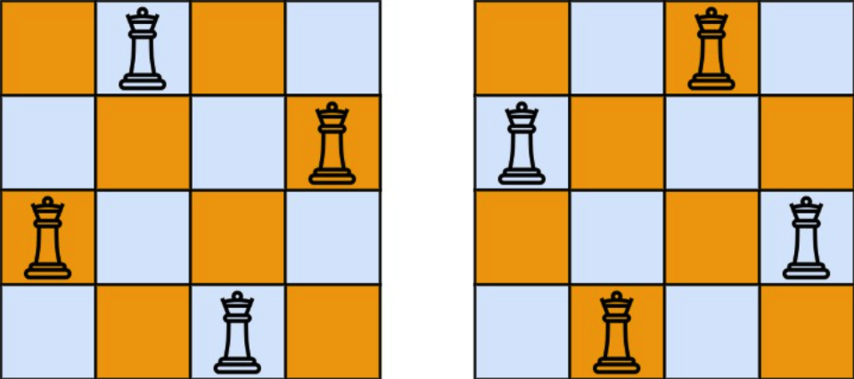 解释:如上图所示,4 皇后问题存在两个不同的解法。