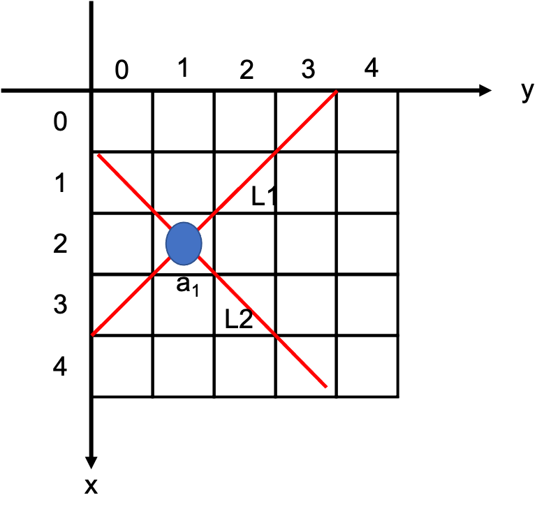 由于每个点都会代表两条对角线,因此我们需要思考一下如何映射对角线,在相同对角线上的点能够映射出来同一条对角线上即可。这里使用直线表达式的截距来进行表示。类似L1的对角线有9条,类似L2的对角线也有9条,即2n-1,我们初始化的时候直接初始化为2n即可。类似L1的表达式为 y = -x+k,类似L2的表达式为y = x+k。然后,为了保证我们创建的对角线截距数组的下标一致,又因为L2的截距是从-4到4,因此需要对其加上n,即y = x+k+n在本图中n为5,这样就保持其截距范围映射到了1到9,与L1的下标映射保持一致。