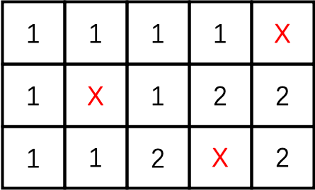 本题和上题不同之处在于本题存在障碍,因此我们需要将存在障碍物的方格的方案数记为0,然后按照之前的推导思路求解。在总体思路上,依旧是动态规划问题的求解方式,推导子问题。以下是一个3x5的存在障碍物的小方格可达路径的情况。