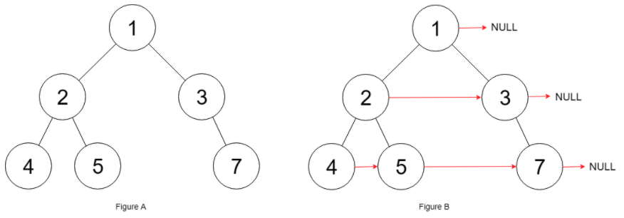 填充它的每个 next 指针,让这个指针指向其下一个右侧节点。如果找不到下一个右侧节点,则将 next 指针设置为 NULL。