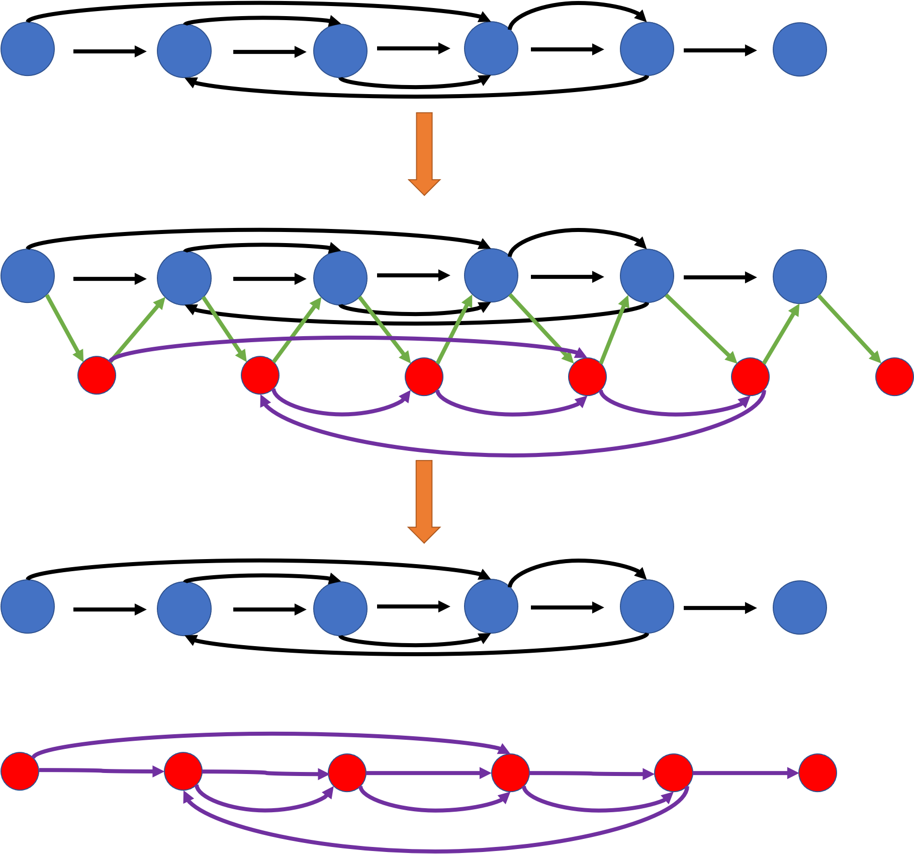 我们将每个节点复制一遍,放到节点的next上,然后,复制的节点指向原节点的next。然后遍历每个原节点,根据原节点的指向,对应地通过原节点的next找到复制的节点,并对应指向相关的节点,最终再将原节点与复制的节点分开即可。
